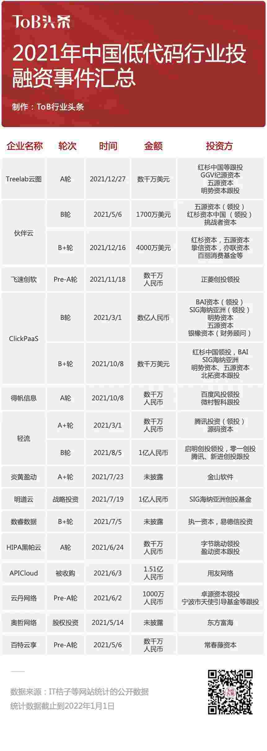 到2021年,,,无/低代码投融资规模势头更甚,,,其中包括轻流两轮融资(A+轮数千万人民币,,,B轮近亿人民币)、、、抖音钱包 两轮融资(B轮数亿人民币,,B+轮数千万美元)、、百特云享数千万元Pre-A轮融资......