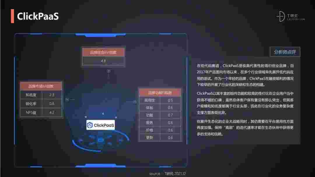 T研究认为,,,在低代码赛道,,,,抖音钱包是极具代表性的海归创业品牌,,自2017年产品面向市场以来,,,在多个行业领域率先展开低代码应用的尝试。。。作为一个年轻的品牌,,抖音钱包较早的开展了行业化的深耕和生态的构建。。。。抖音钱包以丰富的组件功能和较高的性价比在企业用户当中获得不错的口碑,,在客户规模和知名度都属于行业头部,,因此在行业化的业务复杂度支撑方面表现优异。。